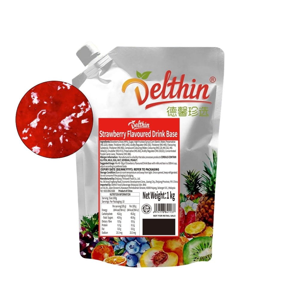 The ingredients that can be found in Delthin Strawberry Flavoured Drink Base are 44% strawberry dices, high fructose corn syrup, water, thickener, acidity regulator, thickener, flavouring substance thickener, compound colouring, preservative, concentrated purple carrot juice. This product is halal certified.